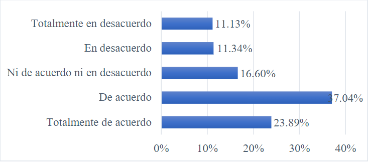 Elaboración propia.Respecto a saber que existen instituciones a las que se puede quejar si una publicidad es inconveniente, encontramos —Figura 7— que el 37.04 % está de acuerdo; el 23.89 % está totalmente de acuerdo; el 16.60 % no está ni de acuerdo ni en desacuerdo; el 11.34 % está en desacuerdo; y el 11.13 % está totalmente en desacuerdo.