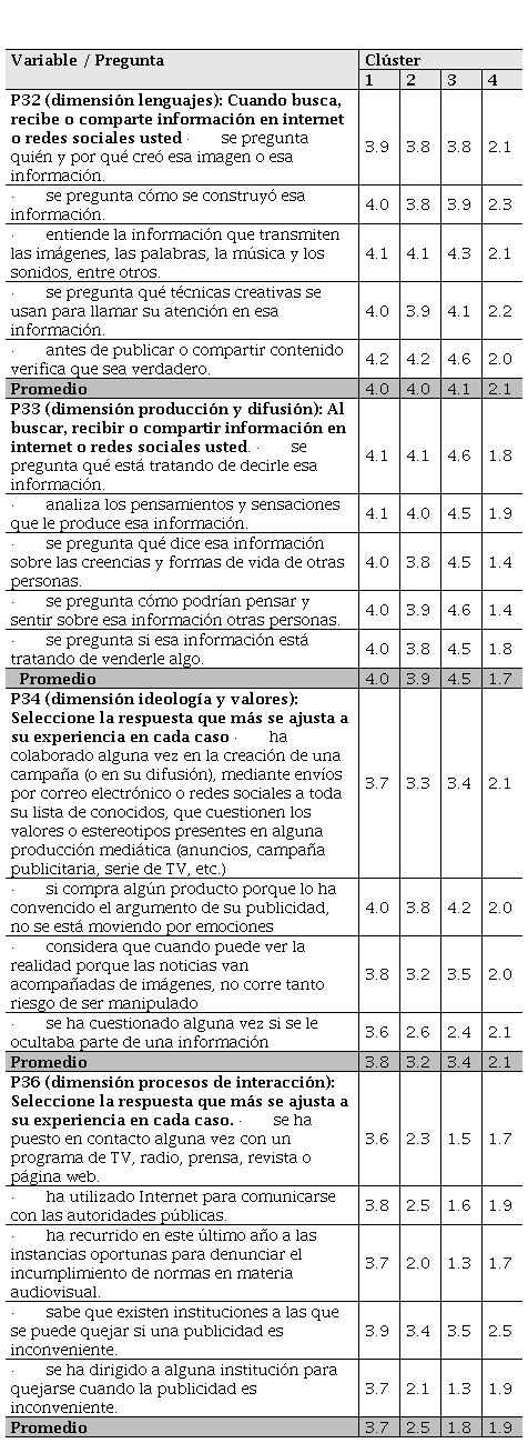 En cuanto a la hipótesis 2, según la cual el pensamiento y ciudadanía críticos son aspectos de las competencias mediáticas que es necesario abordar de manera más efectiva en el proceso formativo de los docentes, vale la pena destacar el hallazgo del análisis multivariado. Al revisar los promedios de las variables más importantes, encontramos que había promedio de calificación más baja relacionada con las actitudes ciudadanas activas relacionadas con la comunicación con autoridades o la veeduría ciudadana ante el contenido de los medios, y en el cuarto clúster, se obtenía un promedio muy bajo.