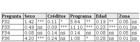 Por último, se realizó un análisis de varianza por cada una de las cuatro preguntas con el fin de evaluar las hipótesis de la relación estadística entre ellas con las características sexo, créditos cursados, programa que cursa, edad del estudiante y zona donde reside. Se observa que la única característica que no presenta relación estadística con las preguntas evaluadas es la zona donde reside, mientras que las demás características presentan diferencia estadística en al menos una de las preguntas. Para evaluar donde está la diferencia se desarrolló una prueba de diferencia mínima significativa (DMS al 5%) —Tabla 3—: