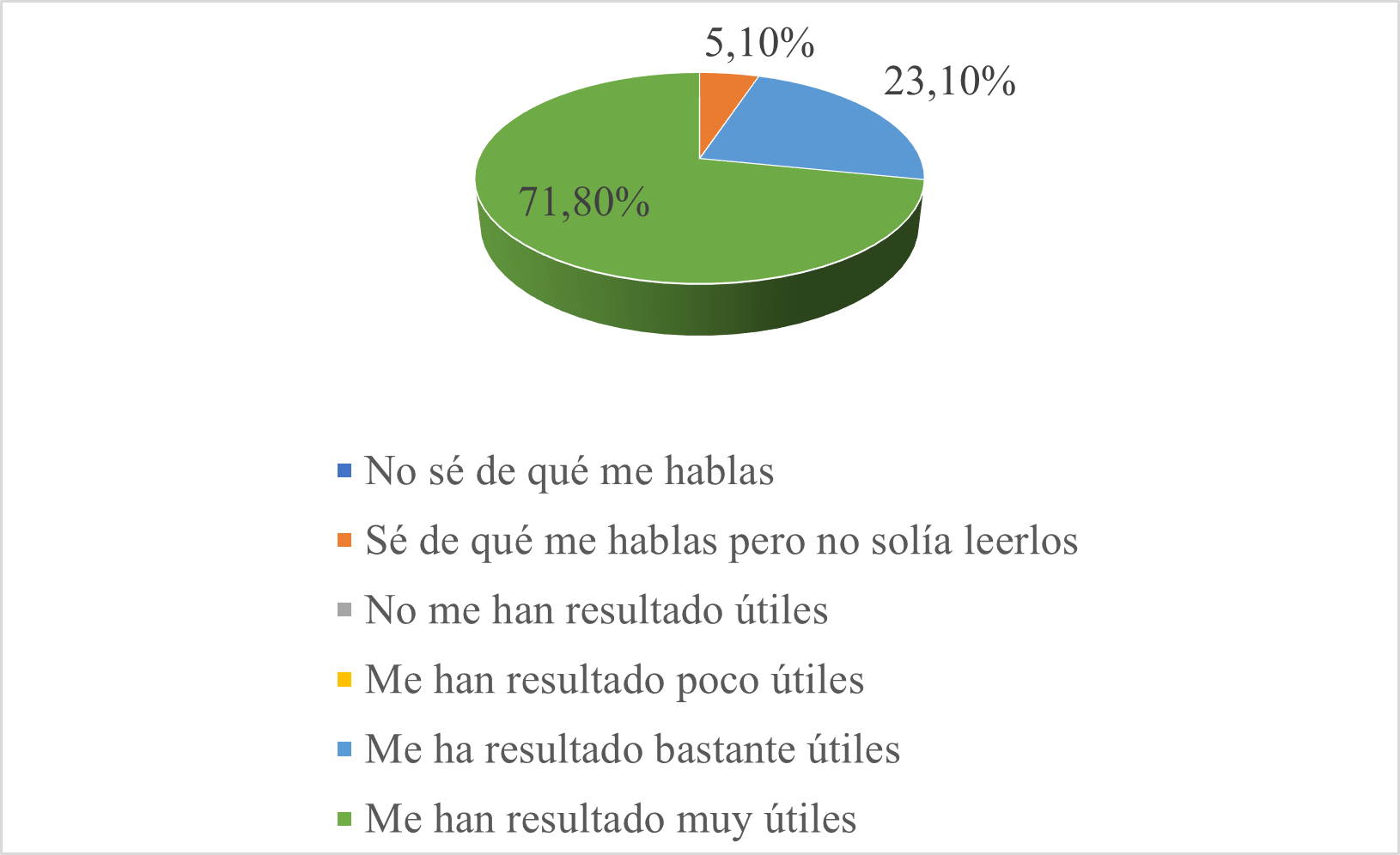 En cuanto a la pregunta planteada acerca de la utilidad de los resúmenes en el foro después de las clases en directo, un 71,8 % de las personas que contestaron considera que estos resúmenes les han resultado “muy útiles” (N=28), un 23,1 % los considera “bastante útiles” (N=9) y únicamente un 5,1 % indicó que “sé de qué me hablas pero no solía leerlos”, lo que equivale a 2 personas del total de 39 —Figura 2—.