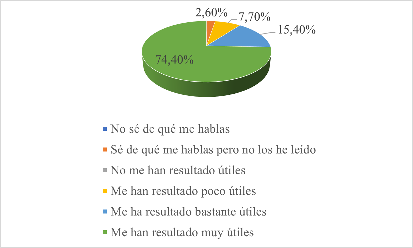 Considerando los mensajes de la docente en el foro referidos a los fallos comunes del examen final de las asignaturas, las cifras indican que un 74,4 % de los estudiantes que ha contestado considera que les han resultado “muy útiles” (N=29), un 15,4 % los ha encontrado “bastante útiles” (N=6), un 7,7 % los califica como “poco útiles” (N=3), mientras que una única persona (2,6 %) ha indicado que “sé de qué me hablas pero no los he leído” —Figura 3—.