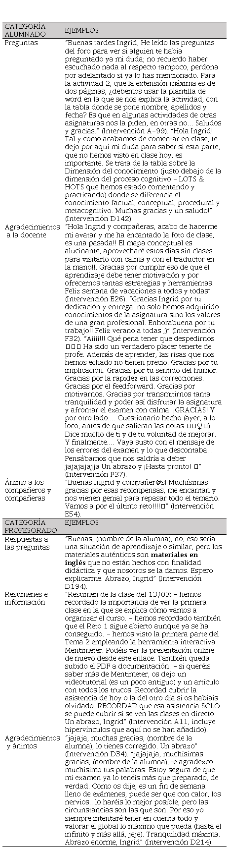 En referencia al análisis cualitativo de las aportaciones a los foros, se han considerado 209 mensajes del alumnado y 319 mensajes de la docente; como ya se había comentado, se trata de una proporción media de 1,5 mensajes de la docente por cada mensaje de los estudiantes. En la tabla 9 se pueden ver ejemplos del tipo de comentarios. Entre los del alumnado, destacan las preguntas, bien sobre el contenido, las actividades, el examen u otras cuestiones de la asignatura; igualmente, se pueden encontrar agradecimientos a la docente y mensajes de ánimo al resto de compañeros y compañeras, sobre todo para superar los retos colaborativos planteados en el Foro de innovación e investigación. Entre los agradecimientos hacia la docente, cabe destacar que algunos hacen referencia a la rapidez de corrección, otros a su implicación general, a su manera de ser, a su sentido del humor y también al aprendizaje adquirido, no únicamente en las clases, sino también a través de los retos voluntarios (ejemplo E-26 en la tabla 9).