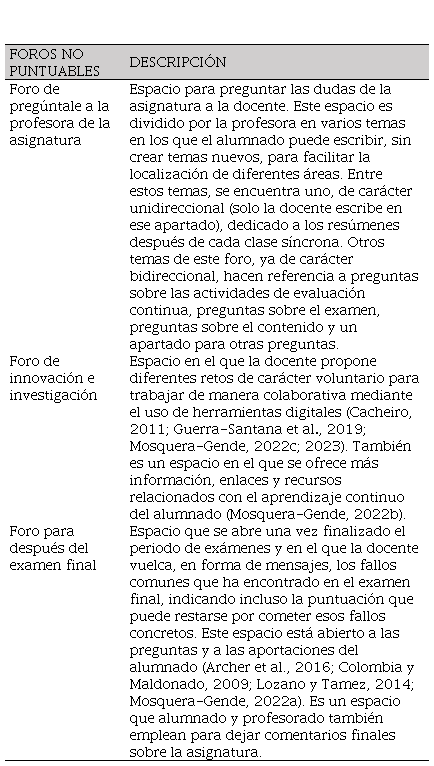 En el desarrollo de las asignaturas en una universidad online es preciso prestar especial atención tanto a aspectos síncronos, como asíncronos, que son los que se tendrán en consideración en este estudio (Amar, 2023; Bernard et al., 2009; López-Navia, 2022; Mosquera-Gende, 2022a; Romero-Alonso et al., 2023). Particularmente, el estudio se centrará en el uso de los foros como elemento clave a la hora de promover y dinamizar el contacto entre los estudiantes y con el profesorado, así como para crear un sentimiento de grupo entre el alumnado (García-Aretio, 2019; García-Ruiz et al., 2023; Hernández-Sellés et al., 2023; Mosquera-Gende, 2022a; Romero-Alonso et al., 2023). En concreto, se considerarán los denominados foros no puntuables, para distinguirlos de los llamados foros puntuables de las asignaturas, que forman parte de la evaluación continua de la mismas y que no serán objeto de estudio, ya que se desea analizar la participación voluntaria (sin calificación) en los foros. Los foros no puntuables de las dos asignaturas son tres: Foro de pregúntale a la profesora de la asignatura, Foro de innovación e investigación y Foro para después del examen. Se pueden ver descritos, explicados y detallados en la tabla 1 del apartado de Metodología y muestra.