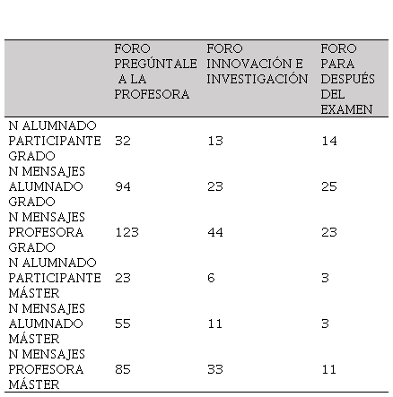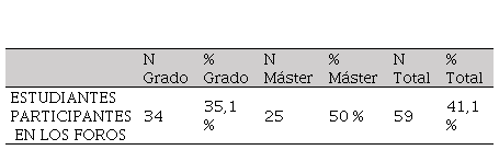 En referencia a la participación en los foros no puntuables, del total de estudiantes matriculados (N=147), el número de discentes que ha participado en los foros es de 59 (un 41,1 % del total), con una distribución de 34 estudiantes participantes en los foros del grado (un 35,1 % del total del alumnado del grado) y 25 estudiantes participantes en el foro del máster (un 50 % de los matriculados en el máster), tal y como se puede ver en la tabla 2.