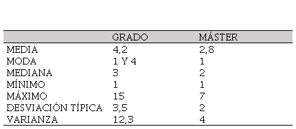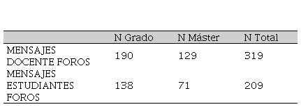 En la tabla 4, se incluye la media del número de mensajes por cada estudiante, tanto para el grado (X=4,2) como para el máster (X=2,8). Esto supone que, aunque, en proporción, participaron menos estudiantes en el grado que en el máster, los que lo hicieron fueron más activos, llegando a publicarse un máximo de 15 mensajes de una misma alumna, mientras que en el máster esta cifra fue de 7 mensajes de una misma persona. Aunque la diferencia disminuye si se toma en consideración la mediana, esta sigue siendo más alta en el grado (Me=3) que en el máster (Me=2). Igualmente, la moda indica que en el grado abundaron los estudiantes que publicaron hasta 4 mensajes, mientras que en el máster la cifra más repetida es la de un único mensaje (Mo=1).