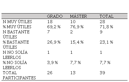Como en el caso anterior, si se analizan los resultados en relación a cada asignatura, en la tabla 7 se puede ver la distribución, destacando la paridad en los porcentajes, salvo por los dos extremos, superando el porcentaje de alumnado del máster (76,9 %) a los del grado (73,1 %) en el número de estudiantes que considera los mensajes finales “muy útiles”. En contraste, únicamente un discente del grado reconoce que “sé de qué me hablas pero no los he leído” (3,8 %), respuesta que no obtiene representación en el máster.