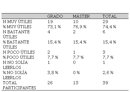 En este punto, a pesar de que los datos fueron similares en el grado y en el máster, se debe señalar que en el grado fueron más positivos que en el máster en relación a los resúmenes (96,1 % escogieron las opciones de “muy útiles” o “bastante útiles”) y en el máster fueron más positivos que en el grado al respecto de los mensajes sobre los fallos después del examen (92,3 % escogieron las opciones de “muy útiles” o “bastante útiles”).