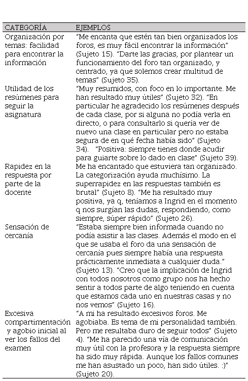 Como se comentaba anteriormente, el breve cuestionario, anónimo y voluntario, suministrado al alumnado al término de la asignatura, incluía una pregunta abierta al final del mismo por si deseaban, de manera optativa, dejar alguna impresión o comentario acerca del uso de los foros durante el curso. De las 39 personas que respondieron al cuestionario, 22 dejaron aportaciones en este apartado. Estas aportaciones se pueden clasificar en cinco categorías básicas, siendo las cuatro primeras positivas y la última negativa —Tabla 8—. Así, destacan las referencias a la organización de los foros, a la utilidad de los resúmenes después de las clases síncronas, a la rapidez en la respuesta por parte de la profesora y a la sensación de cercanía que todo esto supone para los estudiantes. Sin embargo, para algunos de ellos, la organización resulta excesiva y el foro sobre los fallos en el examen les ha supuesto una fuente de estrés.