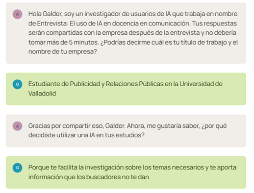 Las entrevistas contaban con un total de 6 preguntas que fueron: P1. ¿Por qué decidiste utilizar una IA?, P2. ¿Qué ventajas aporto a la realización de la tarea por lo que lo utilizaste?, P3. ¿Y qué inconvenientes encontraste en el transcurso de su utilización?, P4. ¿Crees que se va a extender su utilización en el terreno docente?, P5. ¿Consideras que las universidades deberían hacer algo por cambiar el sistema de evaluación?, P6 ¿Consideras que la utilización de estas herramientas es perjudicial?