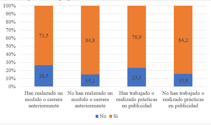 Además, este usuario de aplicaciones de IA —Figura 3—, estudiante de Publicidad y RR.PP., no ha realizado ninguna otra carrera ni modulo con anterioridad a la de Publicidad y RR.PP.—el 84.8 % de los no estudiantes de otras carreras manifiestan ser usuarios de IA— y tampoco ha tenido contacto con el sector de la publicidad ni trabajando ni en prácticas —El 84.2 % de estos manifiestan usar programas de IA—.
