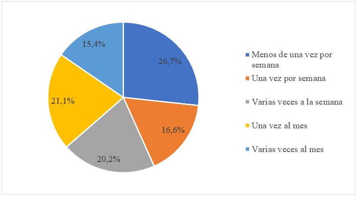 Una vez descubiertas las características de ese alumno de Publicidad que utiliza herramientas de IA, la investigación se focalizó en conocer la frecuencia de uso de estos programas. Los datos mostraron que un 26.7 % de los alumnos utiliza estas herramientas de forma ocasional, manifestando su uso en menos de una vez a la semana y otro 21.1 % dice que su uso es una vez al mes. Por el contrario, tenemos un 20.2 % del alumnado que afirma utilizarlo de manera asidua varias veces a la semana —Figura 4—.