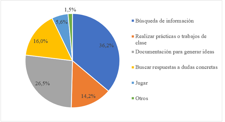 Las entrevistas realizadas a los alumnos que han usado herramientas de IA, reflejaron que entre las motivaciones que llevan a la utilización de este tipo de herramientas se encuentran su capacidad para brindar acceso rápido y fácil a la información. Esto incluye facilitar la investigación, filtrar y proporcionar información que no se encuentra en los motores de búsqueda tradicionales. Concretamente, el entrevistado 8 manifestó “Te facilita la investigación sobre los temas necesarios y te aporta información que los buscadores no te dan”. Además, los alumnos también manifestaron que este tipo de herramientas les simplifica la realización de los trabajos de clase, “Escribí un texto para un trabajo y lo reestructuró la IA para que fuera más comprensible y ordenado” (entrevistado 3).