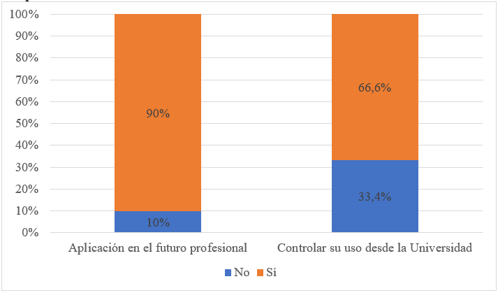 Por último, se preguntó al alumnado sobre si consideraba que iba a utilizar este tipo de herramientas en su futuro profesional y si cree que desde la universidad se debe controlar su uso. Los resultados mostraron que el 90 % cree que va a emplear herramientas de IA dentro de su campo profesional. En cambio, un 66.6 % considera que desde la universidad se tienen que implementar controles sobre el uso de estas aplicaciones —Figura 6—