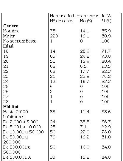 El segundo de los objetivos se centraba en conocer el perfil de esos usuarios de programas de IA —Tabla 1—. En este caso se analizó el perfil de esos 247 alumnos que habían manifestado su utilización. El porcentaje de hombres es levemente mayor —85.9 % de los hombres manifestaron ser usuarios de IA frente al 80.9 % de las mujeres—, de 21 años—el 93.5 % de los encuestados de esa edad manifiestan usar programas de IA—, que viven en pueblos menores de 2.000 habitantes o cuidades pequeñas de 5.001 a 10.000 habitantes—el 88.6 % y el 92.9 % de los que viven en esos núcleos manifiestan ser usuarios de IA— y que trabajan—88.6 % de los que trabajan manifestaron ser usuarios de herramientas IA—.