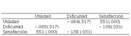 Para comprobar si existía relación entre las diferentes variables analizadas se realizó la correlación de Pearson con un nivel de significación para p=.05. Los datos reflejados en la Tabla 3 mostraron que a medida que aumenta la utilidad manifestada por los alumnos disminuye la dificultad (-.065; p=.317) y aumenta de manera significativa la satisfacción (.551; p=.000) por la aplicación. Sin embargo, cuando aumenta la dificultad manifestada por el alumnado disminuye la utilidad (-.064; p=.317) y la satisfacción por la herramienta (-.0138; p=.031), esta última de manera significativa. Por último, al aumentar la satisfacción con la herramienta incrementa de manera muy significativa la utilidad (.555; p=.000) y disminuye, también significativamente, la dificultad (-.138; p.031) —Tabla 3—:
