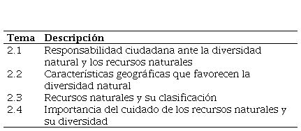 El objetivo de la Unidad 2 en el curso de Geografía es la comprensión de los temas relacionados con la diversidad natural, desde el proceso de formación del planeta y las relaciones que existen entre ésta y la sociedad —Tabla 1—.