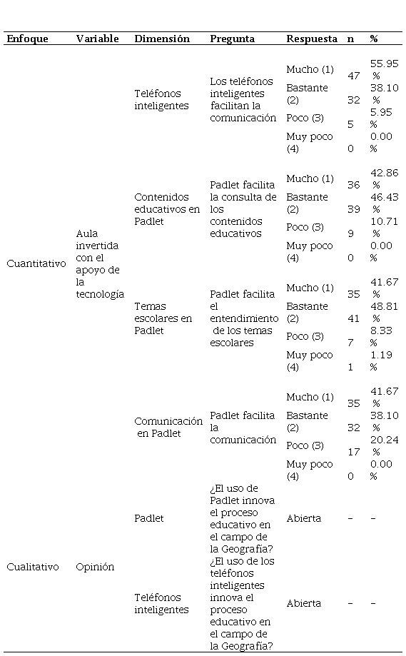 El objetivo general de este estudio mixto es analizar el uso de Padlet y los teléfonos inteligentes bajo la modalidad aula invertida durante el proceso educativo de la Unidad 2 en el curso de Geografía. Las preguntas de investigación son: