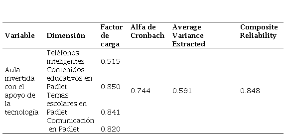 La tabla 3 muestra la validación del cuestionario. Es importante mencionar que el instrumento de medición fue construido considerando las variables de estudio descritas en la Figura 4. Para validar este cuestionario relacionado con el uso del aula invertida en el curso de Geografía se utilizaron los criterios de Factor de carga (> 0.500), Alfa de Cronbach (> 0.700), Average Variance Extracted (> 0.500) y Composite Reliability (> 0.700). En este estudio, los valores del Factor de carga son > 0.510, el valor del Alfa de Cronbach es > 0.740, el valor del Average Variance Extracted es > 0.590 y el valor del Composite Reliability es > 0.840.