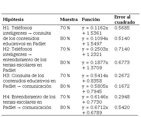 Para la hipótesis 1, los resultados de la regresión lineal con el 70 % (0.1162) y 80 % (0.1094) de la muestra indican que los teléfonos inteligentes afectan positivamente la consulta de los contenidos educativos en Padlet.