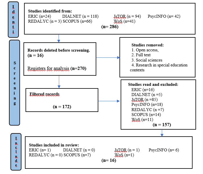 Figure 2 shows 286 documents documents were obtained in the identification stage, the largest number corresponding to DIALNET (44,02%), followed by JsTOR (35,07%). The articles were reviewed according to titles, keywords, and abstracts, by the inclusion criteria. In addition, in some cases, access to the full text was required. Finally, 16 articles were selected, seven SCOPUS (43,75%), six PsyINFO (37,5%), and one each in ERIC, JsTOR, and WoS (6,25%), see Figure two. Systematic reading of the articles was carried out to obtain information related to the research questions, see Table 3.