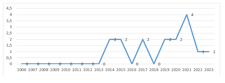 Publications are distributed between the period 2013 and 2023, with 2021 being the year of highest production, accounting for 25% of the total, see Figure 3.