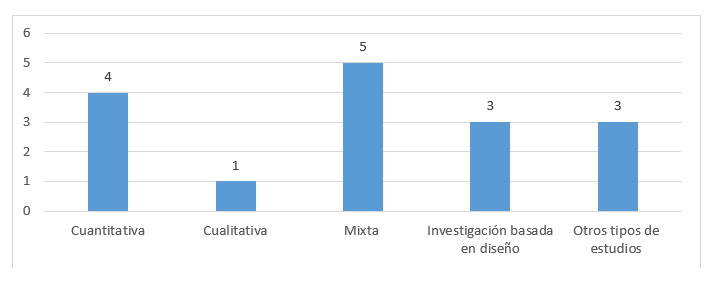 Regarding the type of research, 37,5% are mixed, followed by 25% quantitative and 18,75% design-based research and other types of studies, see Figure 4.