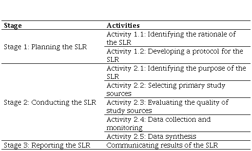 The SLR was conducted considering the stages proposed by Kitchenham (2004), widely used in the social sciences, see Table 1. Furthermore, this SLR aims to develop a research process according to critical and structured protocols (Petticrew & Roberts, 2006).