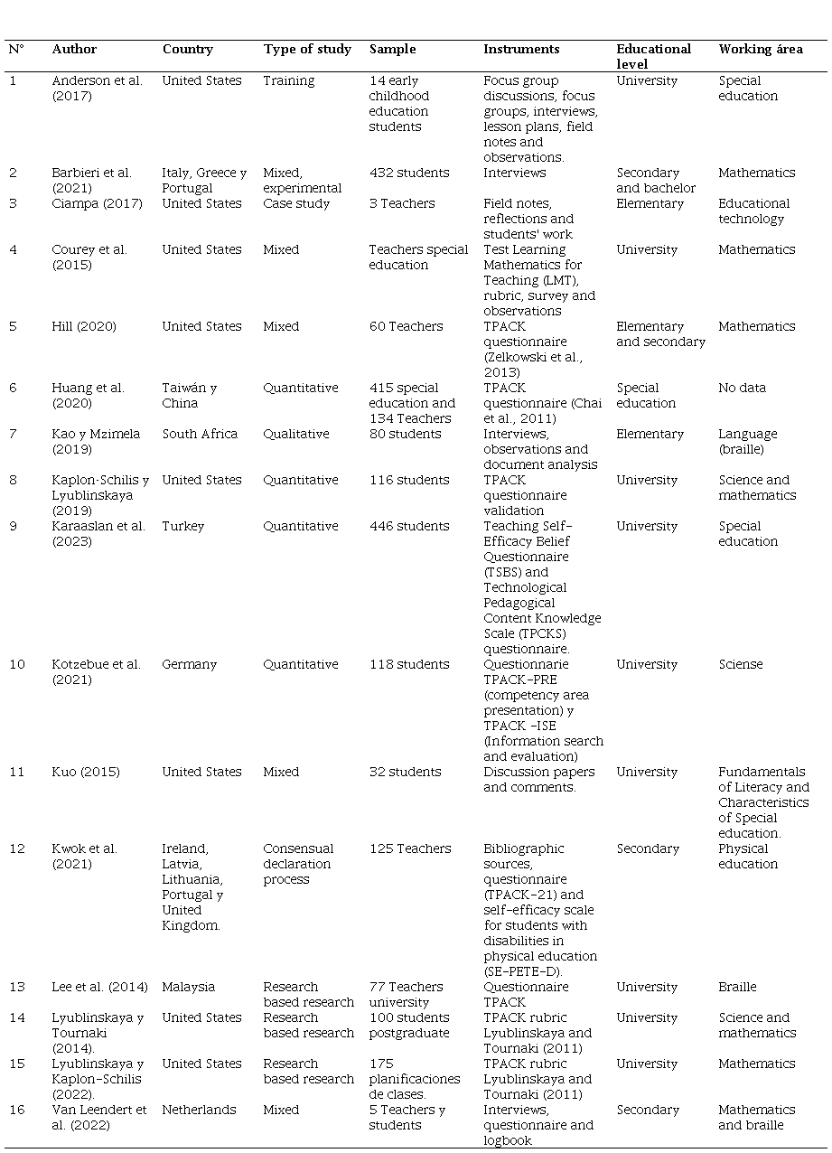 Most of the studies are carried out at the university level, with the United States accounting for half of the research reviewed. Furthermore, the studies use the questionnaire as the most common instrument, with the emergence of new instruments such as TPCKS, TPACK-PRE, TPACK-ISE, and TPACK-21 standing out. In the curricular areas, mathematics and the use of Braille show a more significant development, although at a very preliminary stage.