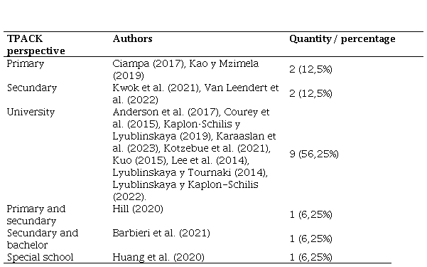 Regarding the studies focused on the university setting, they mostly present design-based, qualitative, and mixed methodologies, which show an average of 129 cases, with the study by Karaaslan et al. (2023) presenting the most significant sample with 446 students, more than 60% of the studies were developed in the United States, including undergraduate and graduate students. The most commonly used instruments were the TPACK questionnaire and rubrics. The study by Anderson et al. (2017) presented the largest variety of instruments including: focus group discussion, focus group, interviews, lesson plans, field notes, and observations.