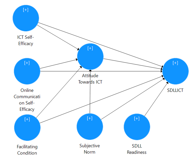 Based on the literature review and theoretical framework, this current study proposed seven constructs consist of ICT self-efficacy, online communication self-efficacy, facilitating conditions, attitude towards ICT, subjective norm, SDLL readiness, and SDLL with ICT. Figure 1 below describes the variables and the model to be proposed in this study as follows: