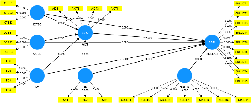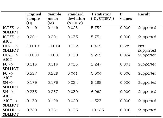 Table 7 below displays the path coefficients of all constructs or variables. As it is possible to observe, all T-values are greater than ±1.96 at 5% level; therefore, all hypotheses except OCSE towards SDLLICT variable are empirically supported. The findings in this study revealed that: H1 ICTSE – SDLLICT with t-statistic = 5.759 and P-value = 0.000. H2 ICTSE – AICT with t-statistic = 5.754 and P-value = 0.000. H3 OCSE – SDLLICT with t-statistic = 0.405 and P-value = 0.685. H4 OCSE – AICT with t-statistic = 2.265 and P-value = 0.024. H5 FC – SDLLICT with t-statistic = 3.247 and P-value = 0.001. H6 FC – AICT with t-statistic = 8.004 and P-value = 0.000. H7 SN – SDLLICT with t-statistic = 5.265 and P-value = 0.000. H8 SN – AICT with t-statistic = 6.092 and P-value = 0.000. H9 AICT – SDLLICT with t-statistic = 4.523 and P-value = 0.000. H10 SDLLR – SDLLICT with t-statistic = 10.985 and P-value = 0.000.