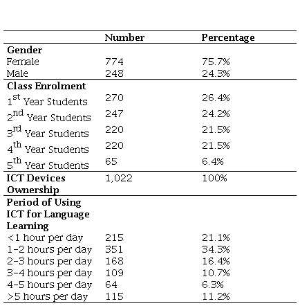 In terms of gender, 774 (75.7%) respondents were female, while 248 (24.3%) were male. The disparity in the number of female and male respondents is due to the fact that female students dominate the majority of the English department students. Around 25% of respondents participated in both their first and second years in the English language department, while 21.5% enrolled in their third and fourth year, and the rest 6.4% enrolled in their fifth year of English department. An additional significant data is that 100% of respondents owned ICT devices (e.g., Laptop, smartphone, or both). Furthermore, the majority of respondents spend their time to use ICT for language learning not more than 2 hours per day.