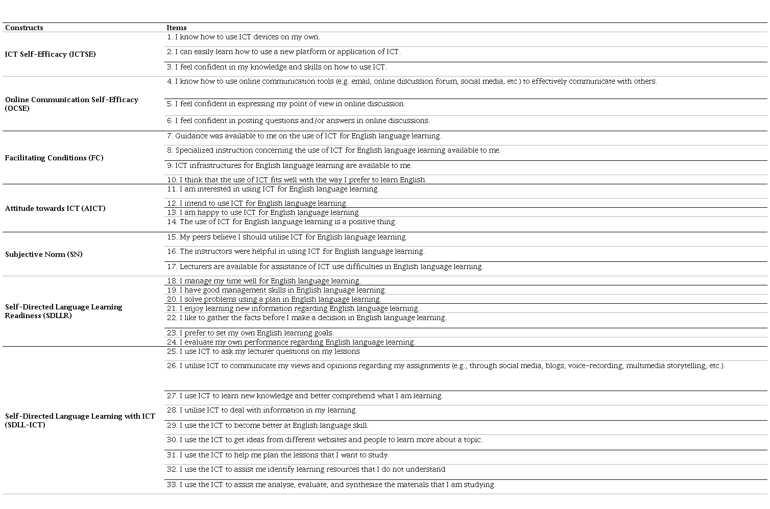 The questionnaire is divided into two sections and has 41 questions. The first section comprised 8 questions pertaining to demographic and situational information including institution affiliation, gender, academic years, ICT devices ownership, and activity in using ICT for SDLL. The second section includes 7 constructs with 33 items and is designed based on research questions and some previous relevant studies, consisting of ICT self-efficacy, online communication self-efficacy, facilitating conditions, attitudes towards ICT, subjective norms, SDLL readiness, and SDLL with ICT. Respondents were asked to indicate their level of agreement or disagreement with each statement. The Likert scale has four potential replies, ranging from strongly disagree (1) to strongly agree (4). Table 2 describes constructs and items of the research instrument.