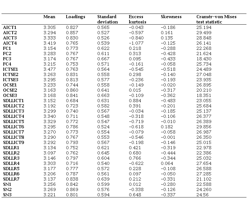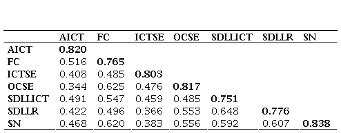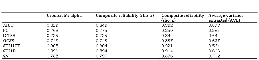 Table 6 displays the discriminant validity. The discriminant validity was tested using the Fornell-Larcker criteria. The square root of any construct value in bold is significantly bigger than the correlation coefficients in the same row or column, demonstrating excellent discriminant validity of the external and internal constructs. AICT has a score of 0.820, FC has a score of 0.765, ICTSE has 0.803, OCSE has 0.817, SDLLICT has 0.751, SDLLR has 0.776, and SN has 0.838. Each construct has a value greater than 0.7, indicating that all the constructs are valid.