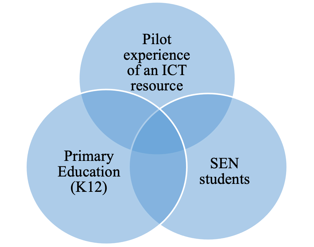 Para el análisis de las experiencias piloto se llevó a cabo una búsqueda bibliográfica en diferentes bases de datos (WOS, Scopus, Dialnet y Google Scholar) sobre experiencias previas en el pilotaje de herramientas TIC en la etapa de EP y enfocadas al alumnado con NEE. Para ello, la búsqueda siguió las recomendaciones de Hempel (2020) basadas en la herramienta PRISMA-P para revisiones sistemáticas. Como se observa en la figura 1, los tres núcleos conceptuales que acotaron la búsqueda fueron “Educación Primaria”, “Alumnado con NEE” y “Experiencia piloto de recursos TIC”.