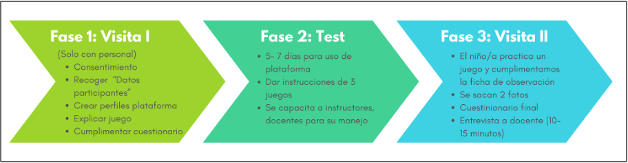 En la Fase 1 se realiza la primera visita al centro. En concreto, se celebró un encuentro con el profesorado para detallar el proceso de la prueba piloto; recabar la información necesaria sobre el centro, el profesorado y el alumnado participante; mostrar y explicar la plataforma; recoger el consentimiento informado; y crear los perfiles de profesorado y alumnado en la plataforma. En esa visita se dejó una hoja informativa con los pasos a seguir con cada escolar para el pilotaje, además de consolidar un contacto de apoyo con el equipo investigador para acompañar el proceso.