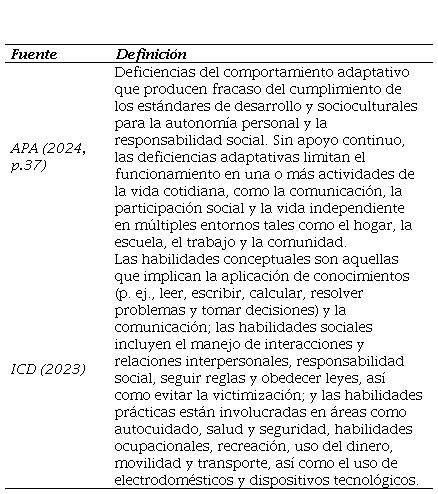 La Asociación Americana de Psiquiatría, referente mundial a nivel de salud mental, utiliza como sinónimos los trastornos del desarrollo intelectual y la DI, y establece diferentes niveles de gravedad: leve, moderado, grave y profundo (APA, 2024). Tal y como recogían Oliveira et al. (2020), la DI se entiende por limitaciones significativas que afectan el funcionamiento intelectual, el comportamiento adaptativo y las habilidades prácticas que interfieren directamente con las relaciones interpersonales y el entorno. Concretamente, la DI supone un trastorno del desarrollo neurológico que comienza en la infancia y se caracteriza por limitaciones en el funcionamiento intelectual (CI = 55-69) y en el comportamiento adaptativo manifiesto en la vida cotidiana (Sajewicz-Radtke et al., 2022). A lo largo de los años, tanto el manual de referencia de salud mental DSM-V como la AAIDD, han dado más importancia al criterio de la conducta adaptativa en la definición de la DI (Tasse et al., 2016). De ahí que se defina la conducta adaptativa como un conjunto de habilidades aprendidas y realizadas por las personas en su vida diaria, clasificadas en los dominios conceptual, social y práctico (Lagos-Luciano et al., 2022). En la tabla 1 se puede observar la denominación que se atribuye a este concepto, tanto por parte de la Asociación Americana de Psiquiatría como por parte de la Organización Mundial de Salud.