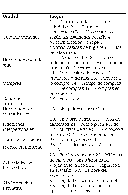 Una vez superada esta etapa y en base a los resultados, se realizó el diseño de una plataforma digital para el desarrollo de la conducta adaptativa del alumnado con DI de EP. Esta plataforma es abierta y accesible a cualquier persona desde la web del proyecto INSIDE. En sí, la plataforma está configurada para que el niño o niña acceda a ella a su propio perfil y, de esta manera, se pueda realizar un seguimiento de su práctica. Para ello, al acceder a la plataforma en la parte superior se configuran los datos sobre la escuela, el o la docente, el alumno o alumna y el idioma en el que se quiere utilizar la plataforma. Una vez que el niño o niña accede, en la parte izquierda de la pantalla aparece el menú con las unidades incluidas, diferenciadas en base a las conductas adaptativas a desarrollar. Cada unidad contiene un número determinado de juegos cuyos contenidos fueron diseñados en base al análisis documental y de los cuestionarios de las fases previas del proyecto —Tabla 2—: