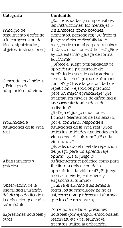 Con todo ello, considerando el trabajo de Saridaki et al. (2007) y los principios de Christakis (2002) como referencias en la evaluación de pilotajes, se diseñó una tabla de observación que fue completada tanto por el profesorado como por las investigadoras durante la última visita y una entrevista al profesorado y demás personal educativo implicado en la educación del alumno con DI. En los resultados de este estudio se utilizarán las partículas “OBS” para información obtenida en las observaciones y “ENT” para datos recabados en las entrevistas con el profesorado. Con el fin de facilitar el contraste de resultados mediante la triangulación de fuentes y métodos, se utilizaron las mismas categorías de análisis tanto en las observaciones como en las entrevistas —Tabla 3—.
