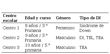 Como ya se ha dicho, este estudio recoge los resultados de la experiencia piloto llevada a cabo en tres escuelas del País Vasco con alumnado que cumple el perfil establecido (DI leve o moderada) escolarizado en centros y aulas ordinarios —Tabla 4—