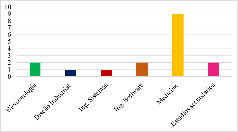 De la figura 1, se puede observar una predominancia de estudiantes del área de la salud, con un total de 9 participantes de la carrera de Medicina. Le siguen las ingenierías: 2 estudiantes de Ingeniería en Software, 1 de Ingeniería en Sistemas y 1 de Diseño Industrial. Además, se cuenta con 2 participantes de la carrera de Biotecnología. Por último, 2 de los participantes aún se encuentran cursando estudios preuniversitarios de un colegio privado de la República Dominicana, lo que aporta diversidad al perfil académico de la muestra.