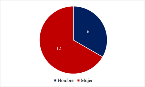 También, se realizó la distribución por sexo, tal como lo indica la figura 2 a continuación. Se puede observar un total de 12 mujeres frente a 6 hombres.