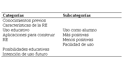 Para el análisis de los datos cualitativos, se utilizó el sofware Pyhton 3.10 con las librerías Pandas y Numpy. En este estudio, se utilizaron variables nominales, un tipo de variable cualitativa que sirve para clasificar datos sin un orden específico, permitiendo así la categorización de la información (Renjith y Arunkumar, 2025). Se utilizaron las 6 categorías descritas por Gallego-Pérez (2018), que agrupan elementos con aspectos específicos de conceptos o temas emergentes en las respuestas recolectadas, lo que facilitó la organización y agrupación de la información para su interpretación (Hazards et al., 2025; Park, 2022; Ren, 2024). La tabla 1 muestra, las categorías y subcategorías utilizadas.