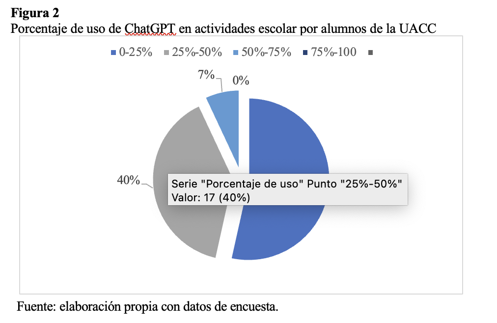Al ser ChatGPT la herramienta más esperada en su uso, se les preguntó a los alumnos con qué frecuencia la utilizaban, encontrando que ningún alumno declaró utilizarla siempre, 4 mencionaron que la utilizan con frecuencia, 23 a veces, 13 rara vez y 3 nunca. Esto es muestra que en el caso de los alumnos de la UACC el uso de herramientas de IA todavía no está tan arraigada en sus actividades escolares. La figura 2 respalda estos resultados, ya que la mayoría de los alumnos utiliza ChatGPT un 25 % del tiempo o menos, en cuanto a sus actividades académicas, sugiriendo así que su incorporación aún es limitada en sus procesos de estudio. Los resultados muestran que ninguno de los alumnos encuestados utiliza esta aplicación al 100 % para sus actividades educativas, lo cual confirma que la IA no está tan incorporada en los procesos educativos de los alumnos de la UACC.