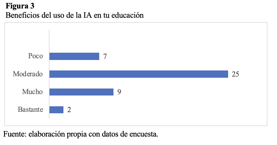 Por otra parte, en cuanto a los beneficios percibidos por el uso de las herramientas de IA en sus estudios, la mayoría considera que el uso de la IA ha sido moderadamente positivo, como se muestra en la figura 3. Resulta llamativo que solo 2 alumnos mencionaran que se han beneficiado bastante de la IA.