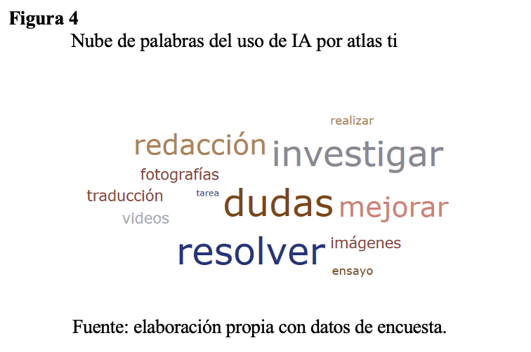 La figura 4 es una nube de palabras creada con el programa atlas ti que muestra las palabras más repetidas en la pregunta abierta, entre las más repetidas esta investigar, redacción, resolver y dudas.