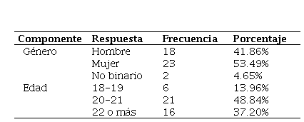 Los datos demográficos de la muestra se describen en la tabla 1, exponen un predominio de mujeres, seguidas por hombres y una mínima cantidad identificados como no binarios, a su vez, el grupo de edad con mayores respuestas recolectadas se encuentra entre los 20 y 21 años, lo que sugiere que la mayoría son alumnos que actualmente estudian el último año de su licenciatura.
