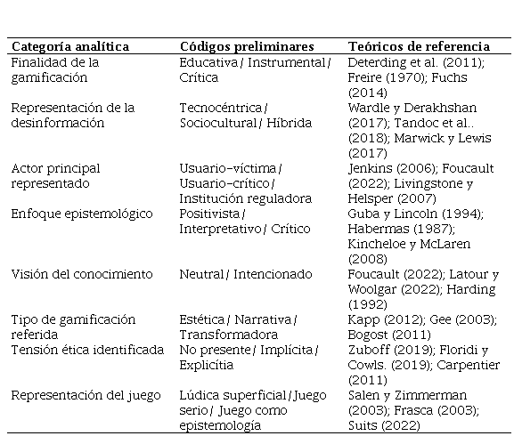 Esta investigación de tipo cualitativo (Bardin, 1996), con enfoque hermenéutico (Suárez Becerra et al., 2025), se centró en la relación entre la gamificación y la desinformación como prácticas simbólicas funcionales en contextos educativos. A nivel general, se tuvieron en cuenta los siguientes pasos: 1) formulación de preguntas de investigación; 2) recuperación muestra del estudio; 3) análisis de contenido según propuesta de Strauss y Corbin (1990), quienes plantean las siguientes fases: Codificación abierta, Agrupación en categorías, Identificación de relaciones, Memo-analítico y reflexión crítica. El análisis de contenido fue complementado con descriptores de frecuencia, acorde con Bardin (1996).