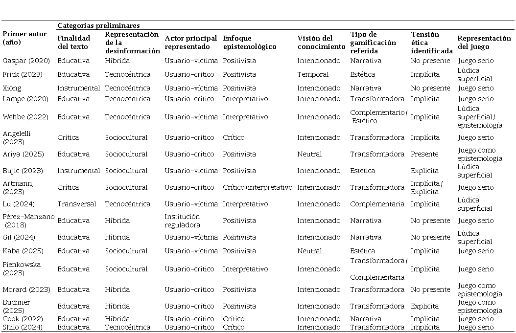 En este contexto, el juego se aleja de sus orígenes recreativos, para adscribirse como dispositivos simbólicos, que se apropian culturalmente, dando marco a una investigación que se estructuró en dos etapas. En la primera etapa se llevó a cabo un análisis bibliométrico, cuyos resultados fueron presentados en el IV Congreso Internacional sobre Innovación Docente, Educación y Transferencia del Conocimiento (Torres-Reyes, 2025a). A partir de esa muestra, se dio inicio a la segunda etapa, correspondiente a este estudio, que tuvo por objetivo: analizar cómo se representa la gamificación como estrategia frente a la desinformación en la literatura científica entre 2011-2025, identificando sus finalidades, actores, formatos, enfoques epistemológicos y relaciones de poder, así como las implicaciones éticas, participativas y políticas que emergen de dichas representaciones.