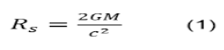 Se considerarmos uma estrela esférica estática de massa M, podemos utilizar a métrica de Schwarzchild para relacionar a massa da estrela com o raio 𝑅𝑠 do seu horizonte de eventos quando se tornar um buraco negro, como descrito na equação (1). Dos postulados da relatividade restrita sabe-se que nada viaja mais rápido que a luz, desta forma o raio de Schwarzchild é obtido considerando a velocidade de escape como c = 3x108m/s, e onde G é a constante universal da gravitação e vale aproximadamente 6,67 x 10−11𝑚3/𝑘𝑔𝑠2.